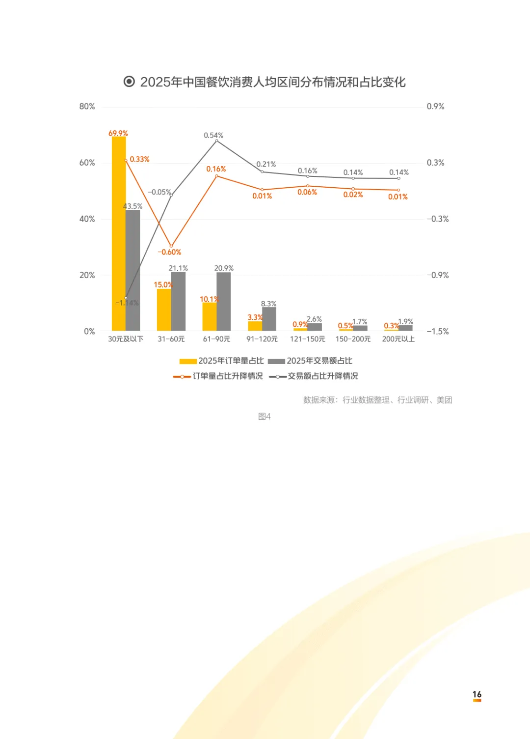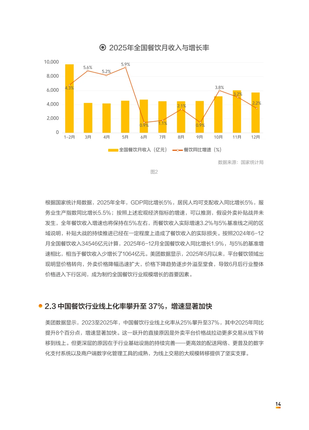 2025 年中国餐饮行业迈入理性消费、存量提质、连锁深化的转型周期,市场规模突破 5.7 万亿元,增速放缓至 3.2%,行业从粗放扩张转向高质量发展,长期主义成为穿越周期的核心逻辑。2025 年全国餐饮收入达 57982 亿元,同比增长 3.2%,增速较过往十年显著放缓,呈现前高后低态势。价格下行与过度补贴导致行业陷入低价内卷,69.9% 的订单集中在 30 元以下区间,商家普遍增收不增利。线上化率快速攀升至 37%,外卖、线上点单成为行业标配,数字化渠道持续渗透。同时行业门店换手率飙升,全年停业商户 339 万家,近六成新门店经营不满两年即出局,市场洗牌加剧。————