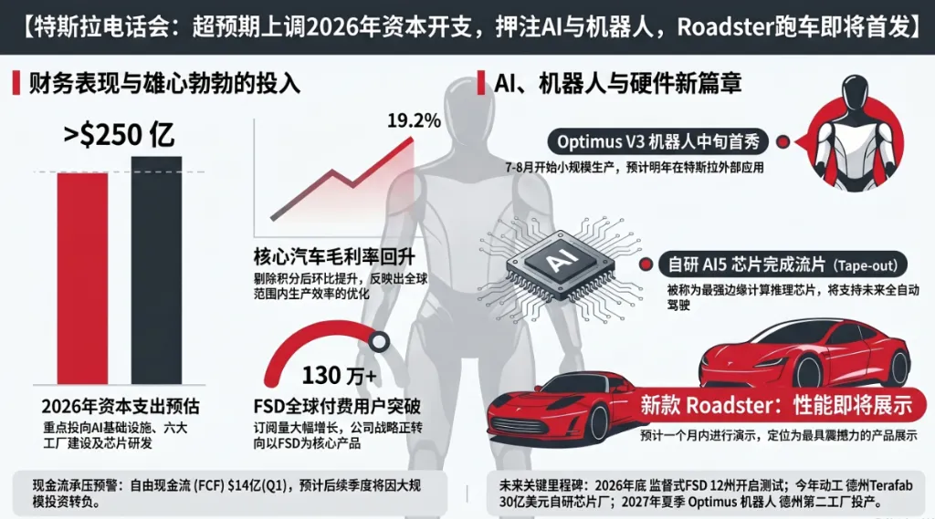 资本支出创纪录:2026年全年资本支出预计超过250亿美元,投入方向涵盖六座工厂建设、AI基础设施、Robotaxi网络扩张、Optimus产线搭建,以及德州研究级芯片制造厂(预算约30亿美元)。