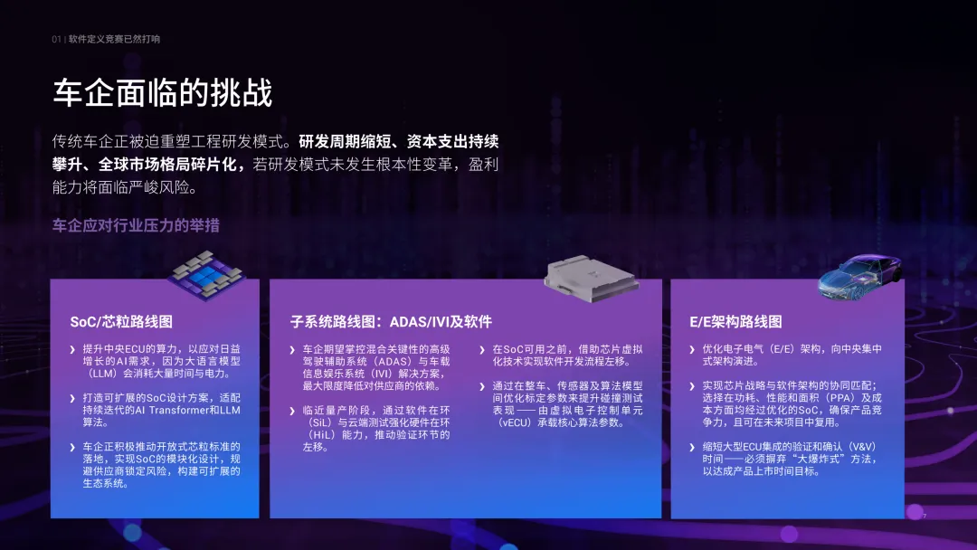 未来行业将全面进入芯片 - 软件 - 系统协同设计、虚拟先行、自动化验证的新范式,中央集中式架构、可扩展芯片方案、云端虚拟研发成为标配,软件定义能力将成为车企核心竞争力。