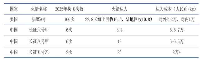 l可回收技术带来的成本革命,降本70%:SpaceX猎鹰9号通过回收复用一级火箭及整流罩,复用两次可降本50%,复用15次以上可降本70%,单次发射成本降至约1万元每公斤。而我国现役火箭多为一次性使用,运力成本普遍在5至8万元每公斤,成本差距达数倍,导致商业发射市场竞争力悬殊。
