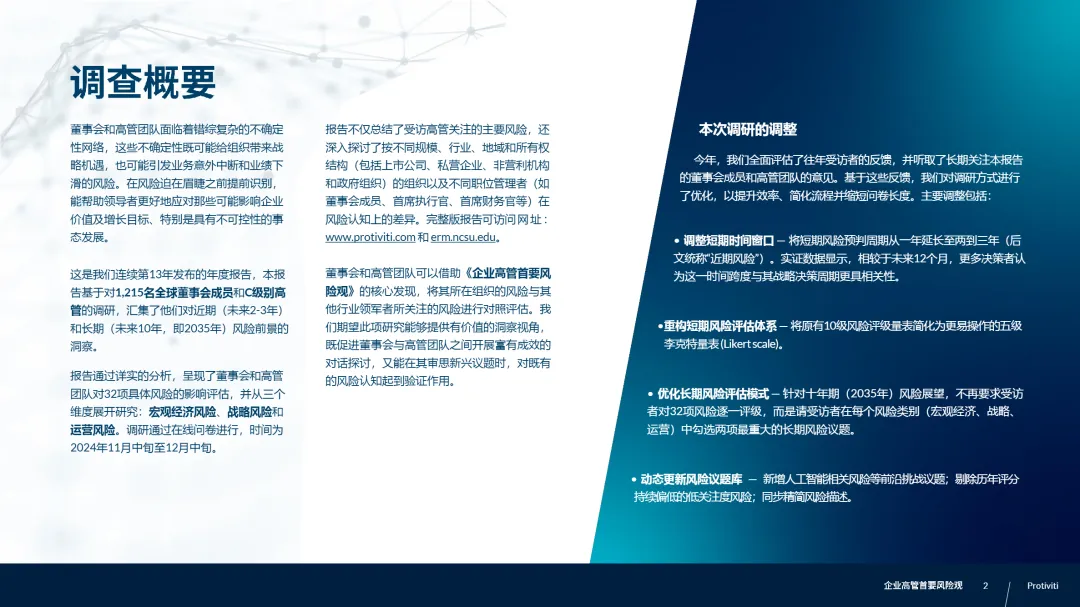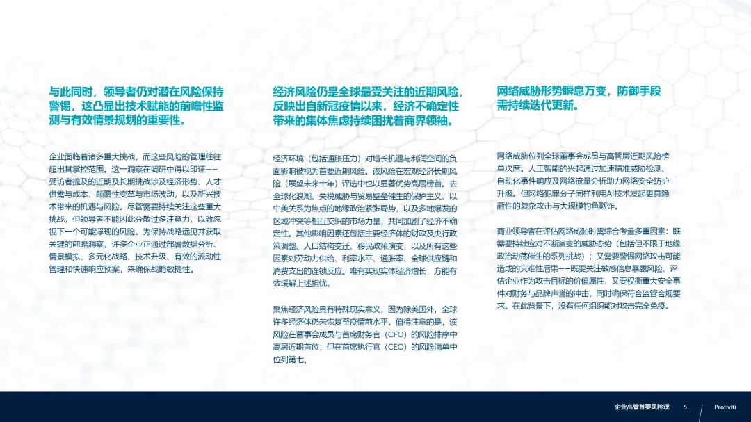 • 长期风险聚焦经济、人才与技术三大维度:至2035年,高管最担忧的长期风险包括经济形势、劳动力成本、颠覆性创新、AI技能短缺与客户忠诚度流失,表明当前挑战具有持续性,企业需将ESG、技能再培训与客户私域运营纳入十年战略框架。