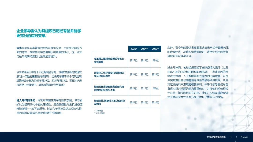 • 组织韧性信心增强,但变革阻力仍在:尽管企业对危机应对能力更自信,但“颠覆性创新”风险排名上升至第8位,显示外部技术迭代速度已逼近组织适应极限;建议通过小步快跑的MVP测试、敏捷组织架构与快速响应预案提升战略柔性。