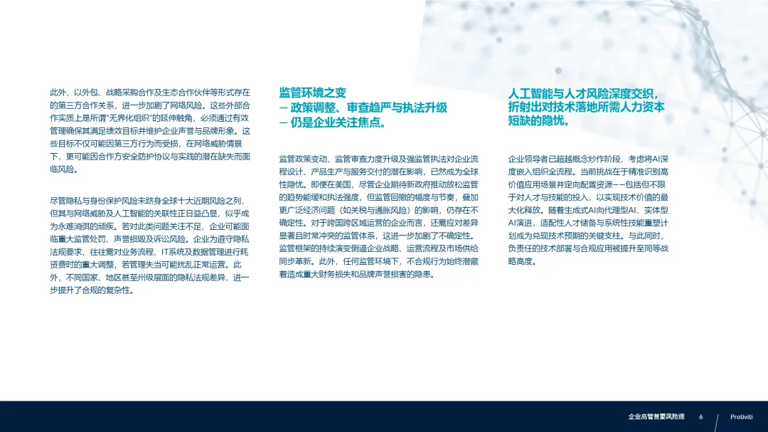 • 网络威胁稳居第二大风险,AI双刃剑效应凸显:AI既提升安全防御能力,也被黑客用于发起更隐蔽的自动化攻击;同时,第三方合作(如海外仓、支付服务商)扩大了攻击面,企业需建立全链路网络安全审计机制,尤其是与生态伙伴的接口安全。