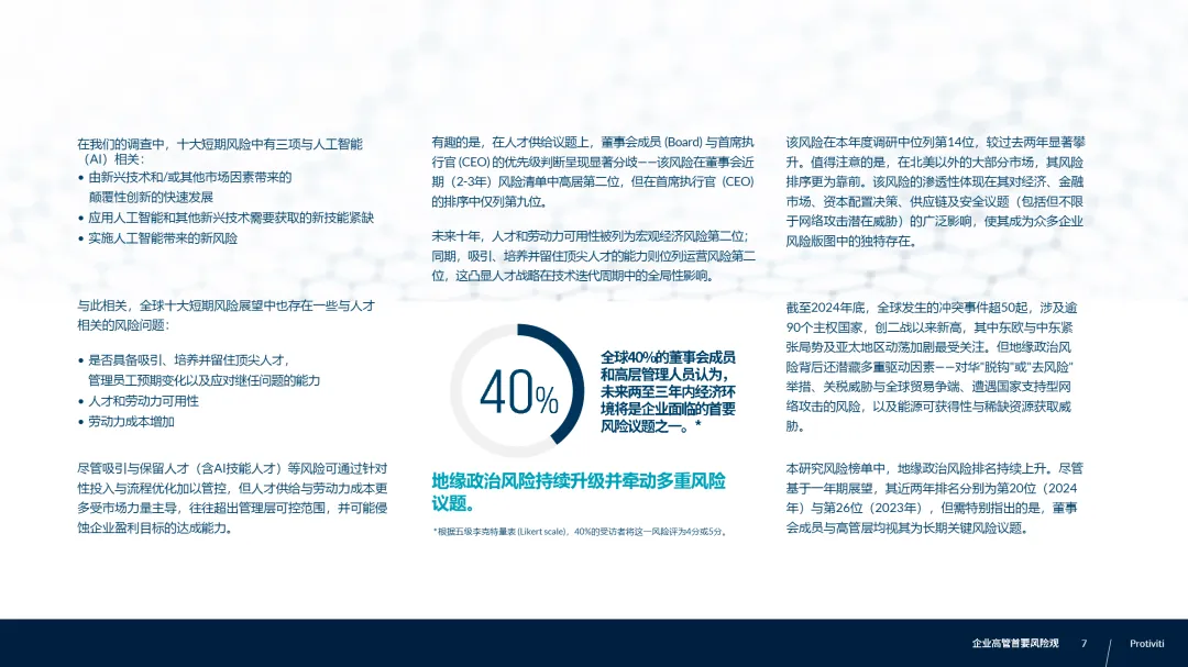 • 人才与AI技能短缺形成“双重夹击”:三项AI相关风险(颠覆性创新、技能紧缺、实施风险)进入十大近期风险,而“吸引与保留顶尖人才”在董事会眼中排第二,CEO仅排第九,暴露战略层与执行层的认知错位,企业亟需构建AI时代的人才重塑计划与激励机制。