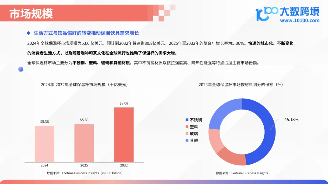 • 市场规模与增长预测:2024年全球保温杯市场规模达53.6亿美元,预计2032年将增长至80.8亿美元,复合年增长率为5.36%;其中智能水瓶市场增速更快,2024年规模为402亿美元,预计2034年将达1282亿美元,CAGR高达12.3%。