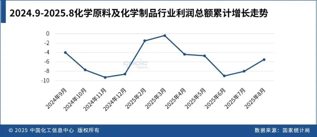 截至2025年8月,化学原料及化学制品行业实现利润总额2460.8亿元,同比下降5.5%,营业收入利润率为4.1%,同比下降0.3个百分点,较2024年下降0.5个百分点,与前7个月基本持平,行业盈利能力持续承压。