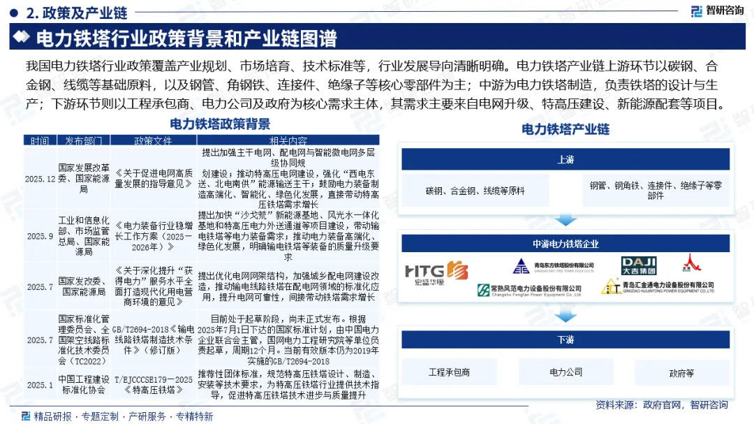 行业政策:我国电力铁塔行业政策覆盖产业规划、市场培育、技术标准等,行业发展导向清晰明确。T/EJCCCSE179—2025《特高压铁塔》《关于深化提升“获得电力”服务水平全面打造现代化用电营商环境的意见》《输电线路铁塔制造技术条件》《电力装备行业稳增长工作方案(2025—2026年)》《关于促进电网高质量发展的指导意见》。