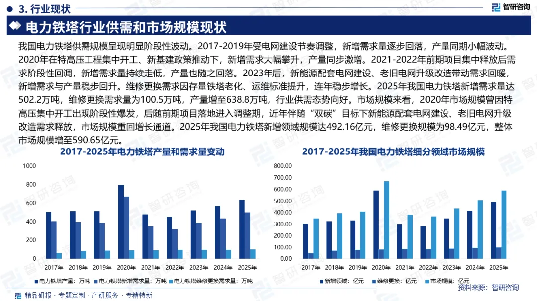 中国市场规模:2020年市场规模曾因特高压集中开工出现阶段性爆发,后随前期项目落地进入调整期,近年伴随“双碳”目标下新能源配套电网建设、老旧电网升级改造需求释放,市场规模重回增长通道。2025年我国电力铁塔新增领域规模达492.16亿元,维修更换规模为98.49亿元,整体市场规模增至590.65亿元。
