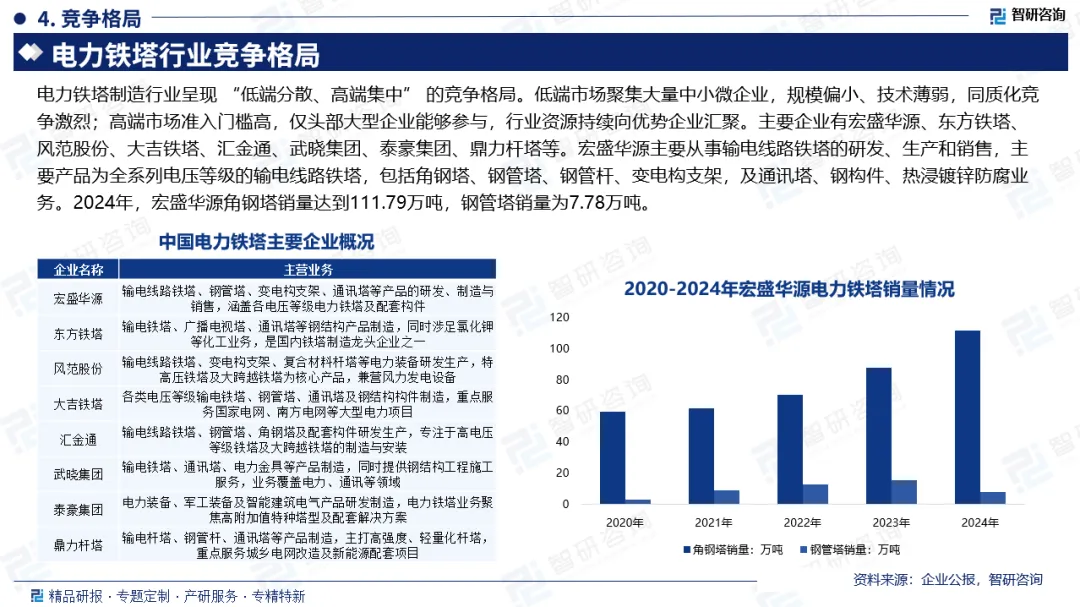 竞争情况:电力铁塔制造行业呈现 “低端分散、高端集中” 的竞争格局。低端市场聚集大量中小微企业,规模偏小、技术薄弱,同质化竞争激烈;高端市场准入门槛高,仅头部大型企业能够参与,行业资源持续向优势企业汇聚。