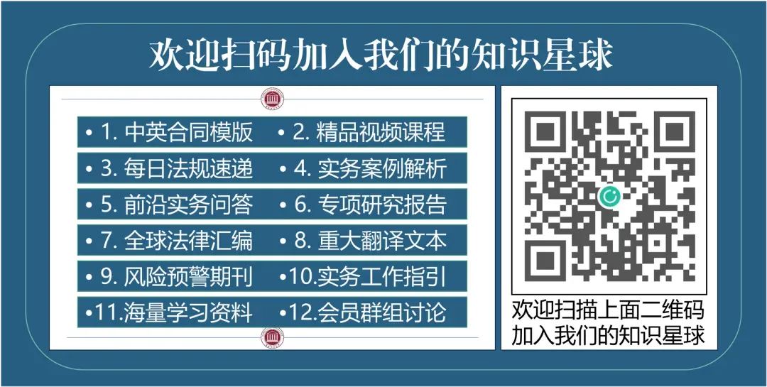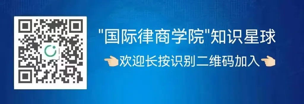“国际律商学院”知识星球是专注国际法律、合规与商务实务的专业知识共享平台、实务教育培训平台、实务问答互动社区、和涉外法律数据库,对外提供“中英合同模版、在线实务问答、精品视频课程、企业出海法律合规风险预警期刊、实务案例解析、专项研究报告、实务工作指引、全球法律汇编、重大翻译文本、实务学习资料、微信交流群组、打卡学习”等产品和服务,其内容由长期深耕实务一线的资深法律实务专家和律师制作并提供,欢迎加入我们参加学习(加入方式见文末)!