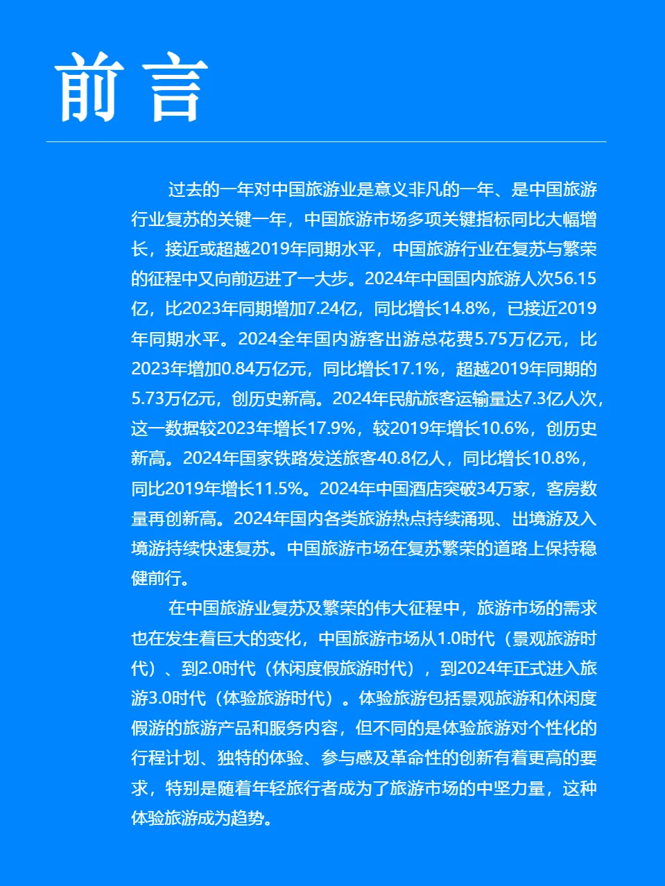 • 中国旅游市场正式迈入“体验旅游时代”:2024年国内旅游收入达5.75万亿元,创历史新高,旅行者不再满足于“打卡式”观光,而是追求“感官+身心+参与感”的巅峰体验,Z世代尤为看重“是否值得发朋友圈”。