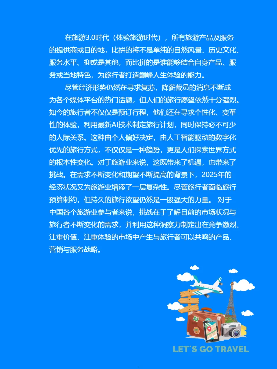 应用场景:适用于制定2025年海外目的地营销策略、设计针对Z世代的沉浸式旅行产品、搭建基于小红书/抖音的种草投放模型、开发“旅居+工作”一体化服务方案时作为核心数据支撑与趋势判断依据,助力实现更高ROI的品牌曝光与转化。