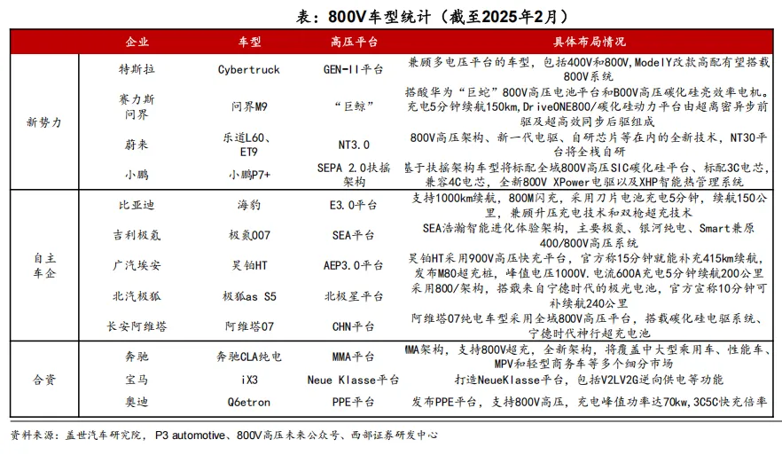 • 政策推动+2025年800V新车型上市。根据佐思汽研统计,2024年中国800V高压架构乘用车累计销售84万辆,同比增185%,市场渗透率6.9%。2025年2月,国家发改委明确要求2025年底前实现全国高速公路服务区800V充电桩100%覆盖,总投入超120亿元,且随着更多800V新车型的发布,预计到2025年渗透率将达到15%。