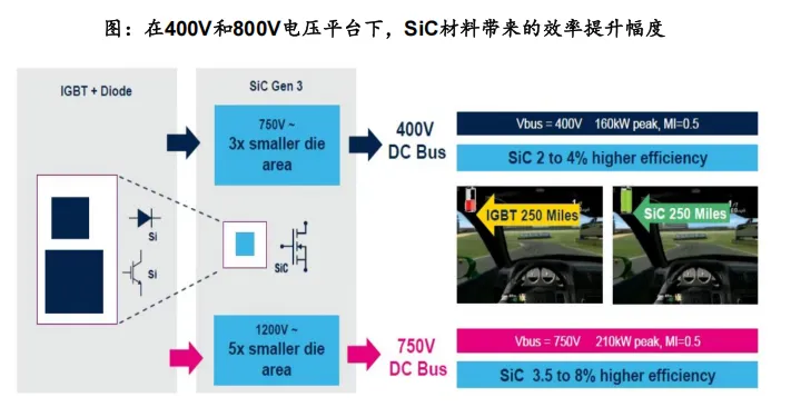 • 高压下SiC器件可实现更高效率并提高功率密度,替代Si基是行业发展趋势。根据意法半导体,在400V电压平台下,相较于硅基IGBT,SiC器件有2-4%的效率提升;在750V电压平台下,SiC器件有3.5%-8%的效率提升;根据ROHM的数据,相同规格的SiC MOSFET的尺寸是Si MOSFET的1/10,能够减小产品的体积和重量。