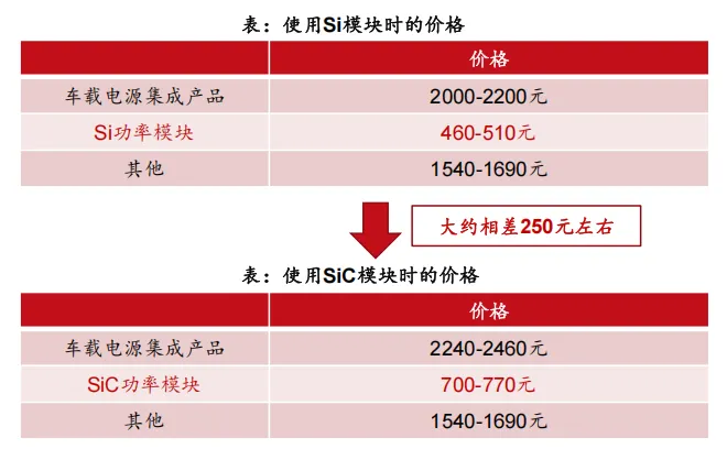 • SiC版本车载电源增价250元,推动整体ASP上升。800V产品价值量提升主要来自SiC功率器件,在车载电源中,Si功率模块成本占比23%。目前碳化硅模块成本是硅的1.5倍左右,根据测算,用SIC器件时车载电源价值量将大约提升250元左右。