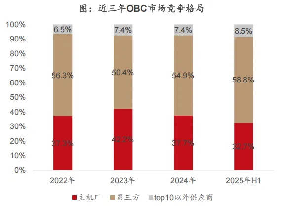 公司是车载电源行业龙头,2025年H1OBC市场份额26%,在第三方供货市场中稳居第一。公司从工业电源起家,09年开始布局车载电源,21年后逐渐实现电驱总成和液冷充电桩模块量产出货。车载电源为公司基本盘业务,占比在80%以上。公司凭借技术和成本优势实现市场份额快速提升,国内稳定供应上汽、理想、吉利、奇瑞、长安等核心车企大客户,2024年新获上汽奥迪及长城某热门车型定点。2025H1国内第三方OBC供货市场中威迈斯份额26%,相比2020年提升3pct。