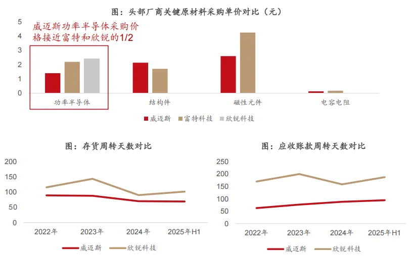 (3)头部厂商能够掌握供应链话语权。对上游,头部厂商产业地位高导致采购单价更低、保供优先级更高。以成本占比最高的功率半导体为例,规模最大的威迈斯采购功率半导体时的价格接近欣锐科技的1/2;对下游,规模越大话语权越高,现金循环周期越短。
