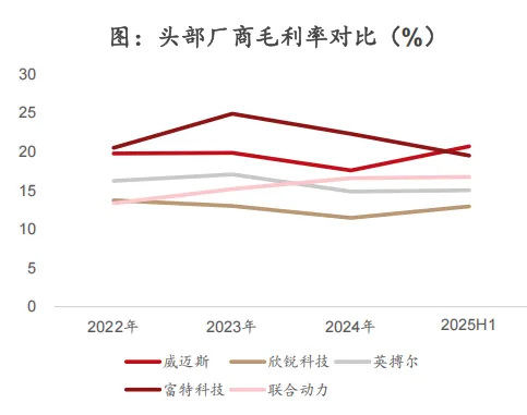 由于下游整车价格竞争较激烈,车载电源行业利润率整体呈下行趋势。威迈斯通过规模优势、出海、自研磁集成技术并不断推出新一代产品,在净利率和毛利率上均获逆势增长,净利率从22年的7.7%增长至25年H1的9.2%,在规模和盈利水平方面都维持行业第一梯队。