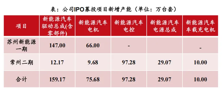 IPO募资扩产40万套电源总成,规模化降本能力提升。2022-2024年,公司快速提升产能及其利用率,2024年电源系统产能近130万套,产能利用率接近93%。24年底,公司IPO申请获深交所受理,拟募集26.1亿元用于进一步扩大产能,建设苏州新能源一期和常州生产基地二期,苏州新能源一期预计建设周期为3年。募投项目建设完成后,预计公司电源总成和OBC新增近40万台套。公司通过IPO募资加速产能扩张有望进一步依托其规模化制造优势降低边际成本,并驱动市占率持续上升。