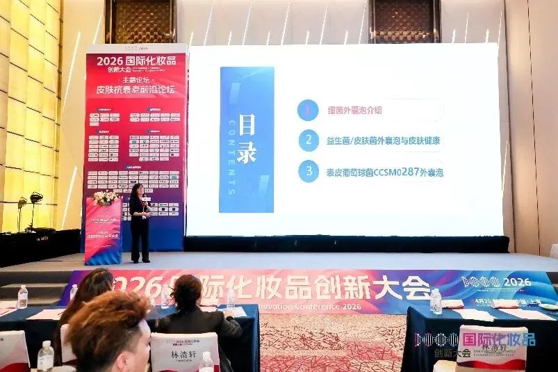 2026年4月20日-22日,以“产研融通,生态共建”为核心主题的2026国际化妆品创新大会(ICIC)在上海隆重召开。微生态与皮肤健康团队邵丽副教授在“主题论坛——皮肤抗衰老前沿论坛”发表了题为《皮肤共生表皮葡萄球菌源外囊泡维护表皮稳态研究》的专题报告。