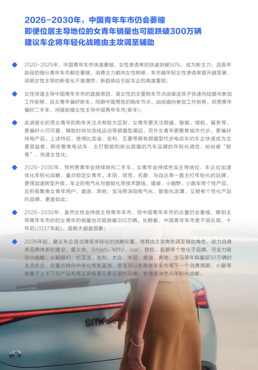 2020-2025年,中国青年车市的快速菱缩与女性化,让不少车企的年轻化战略摔不及防,类似上汽乘用车等把年轻化战略升级为核心战略的车企,更加举步维艰。2026-2030年,中国青年车市会如何演变?相应车企该如何有效应对?