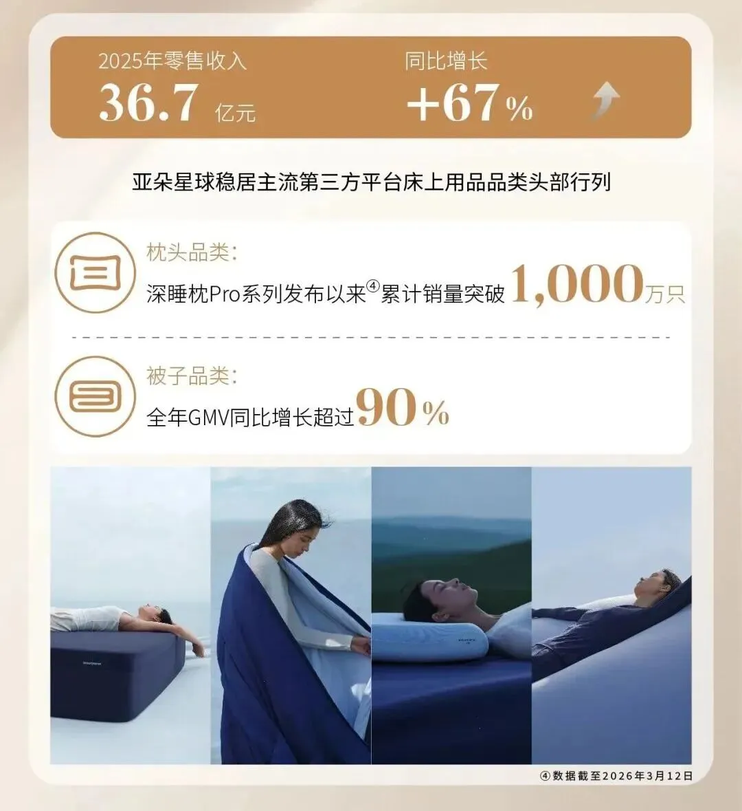 正如亚朵集团创始人耶律胤所说,10年前开始时亚朵零售只是一笔“顺手”的生意,8年前自己希望能将零售收入占比做到40%-50%,如今那个看似疯狂的想法已经变成了现实——亚朵零售在2025年卖出400多万只深睡枕。