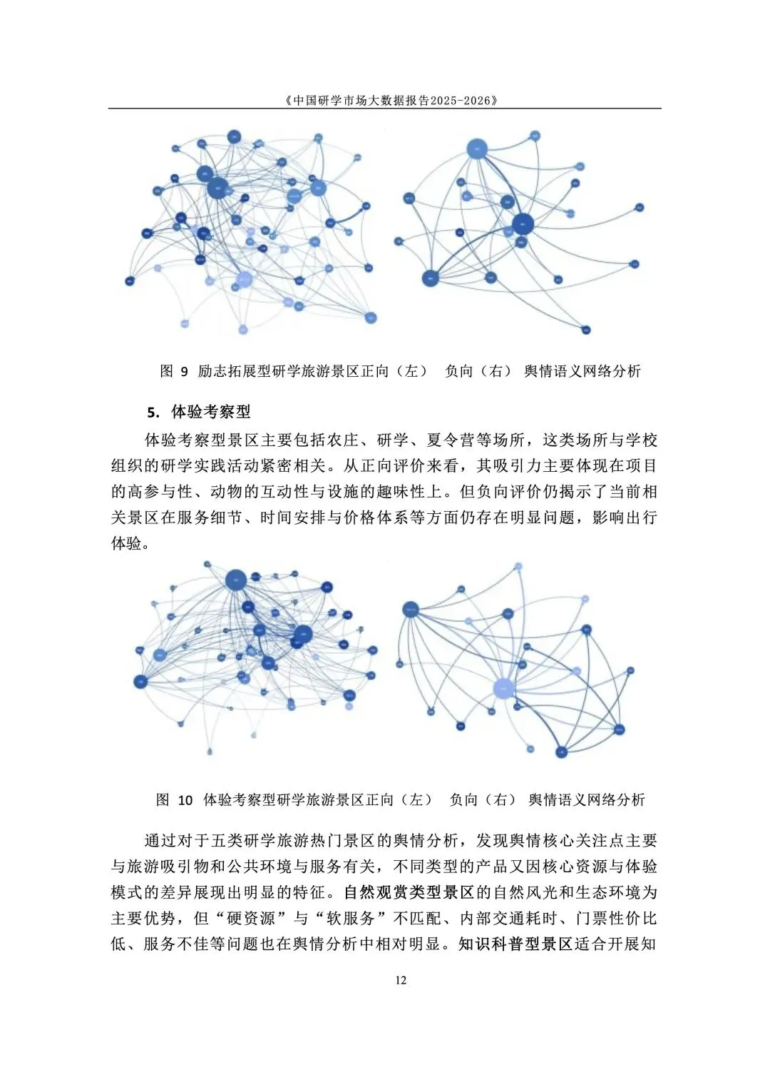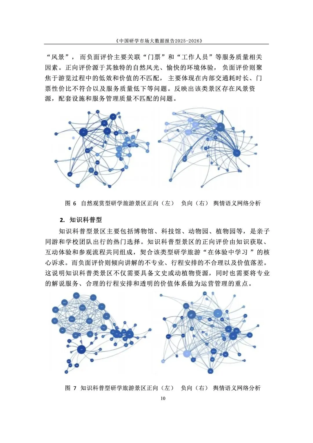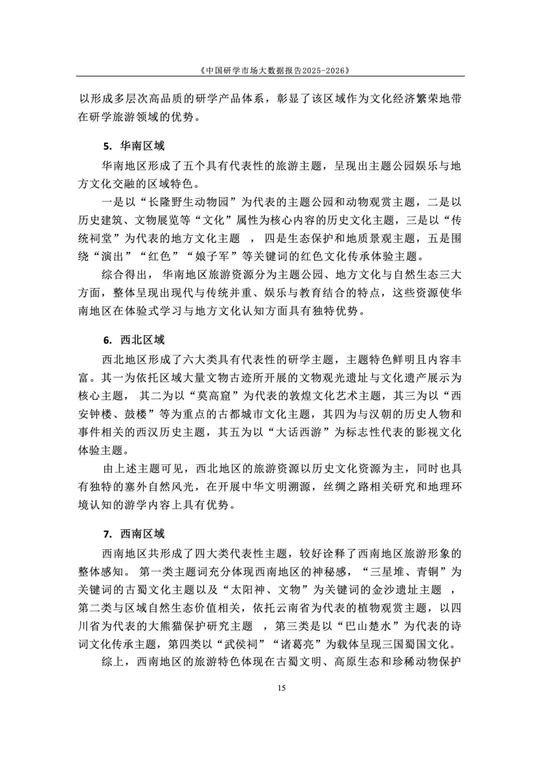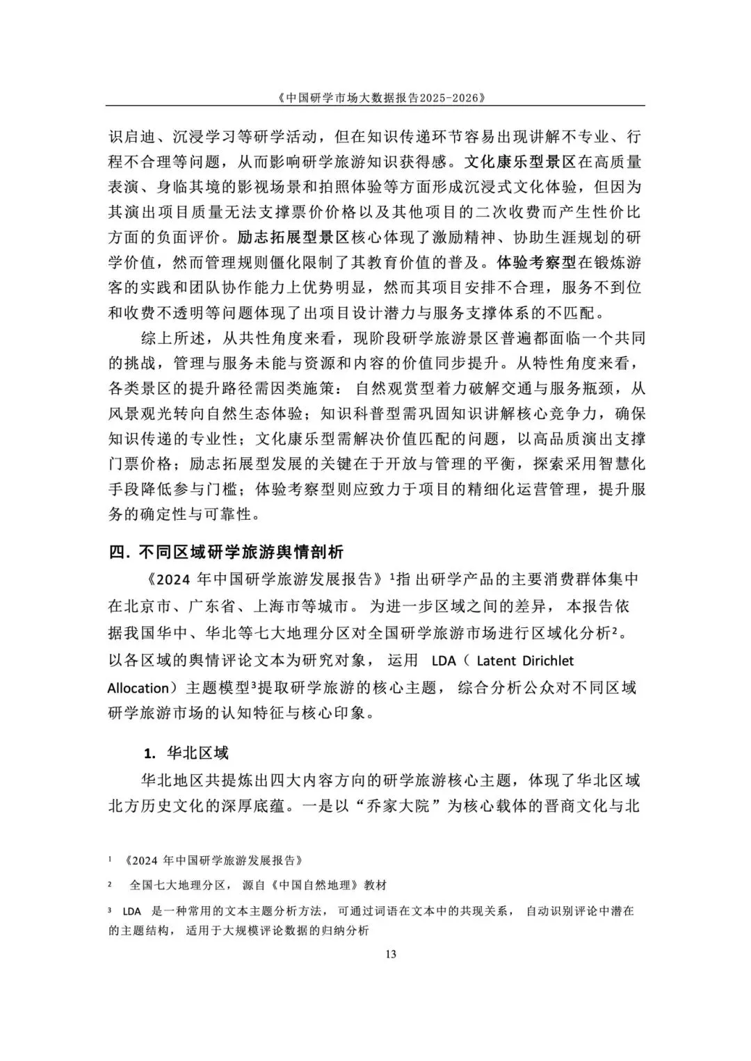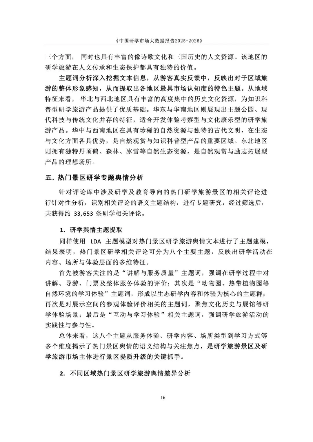 政策与标准双轮驱动,研学纳入正规教育与人才体系。国家将研学实践纳入素质教育,2025 年发布《研学旅游服务要求》行业标准,“研学旅行管理与服务” 纳入高职专业。各地建立安全责任体系与校长负责制,行业从野蛮生长进入标准化、课程化、安全化的高质量发展新阶段,政策长期利好。 市场结构呈梯度分布,学校主导、中小机构为主、区域分化明显。研学消费呈 “低端走量、中端升级、高端定制” 格局,学校组织占主导,专业机构次之。市场主体以旅行社、研学基地为主,中小机构占绝大多数。区域上华东热度最高,华中华北以科普为主,华南体验活跃,西南人文与生态并重,东北以生态研学见长。 用户以中小学家庭为核心,需求从泛体验转向目标化与分层化。核心用户为 K12 学生与家长,学段差异显著:小学重体验、中学重知识与实践。出行以团体大规模与亲子小团并行,团体驱动规模、亲子驱动品质升级。家庭决策更理性,重视教育价值、安全保障、服务质量与性价比,拒绝低质走马观花。 景区研学舆情整体向好,服务与讲解是满意度核心变量。千万评论数据显示,励志拓展、知识科普、自然观赏好评率超 80%。正面集中于风景、知识、互动、体验;负面集中于讲解不专业、行程不合理、门票性价比低、二次消费、服务态度、管理僵化。服务与内容短板成为行业普遍痛点。 行业从规模转向质量,三大趋势重塑竞争格局。一是从资源驱动转向课程 + 服务 + 安全综合能力驱动;二是供给因类施策,自然型补服务、科普型强讲解、文化型提性价比、拓展型优管理;三是区域特色化、品牌化、跨区域联动,文旅深度融合成为提质核心,专业化、数字化、精细化成必由之路。