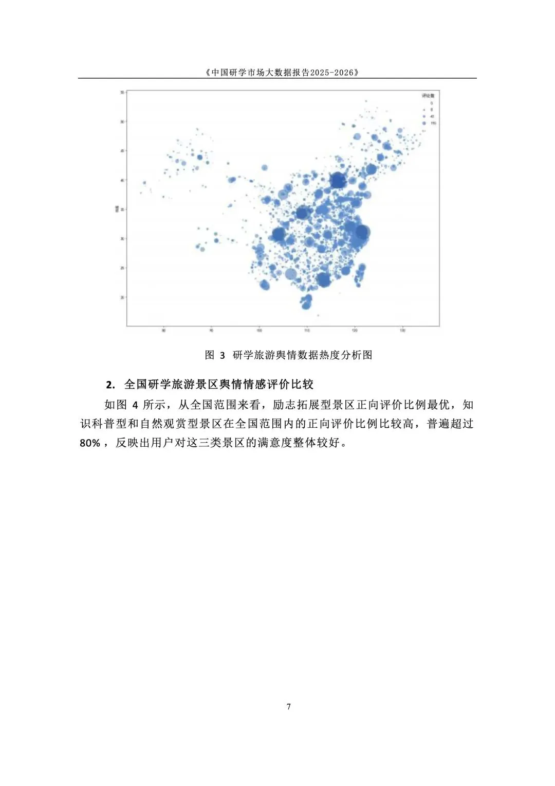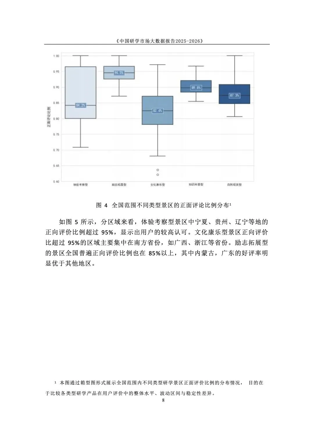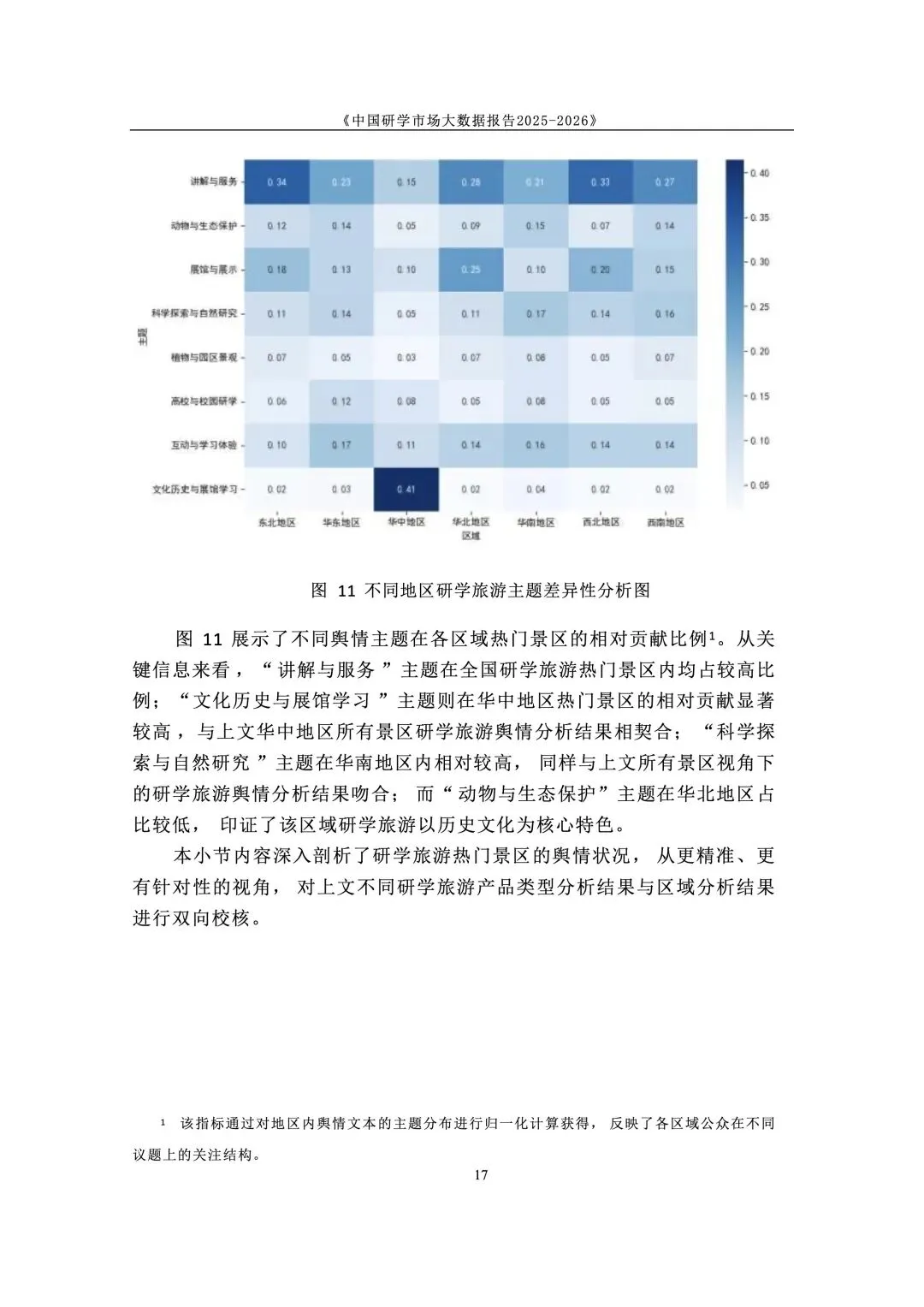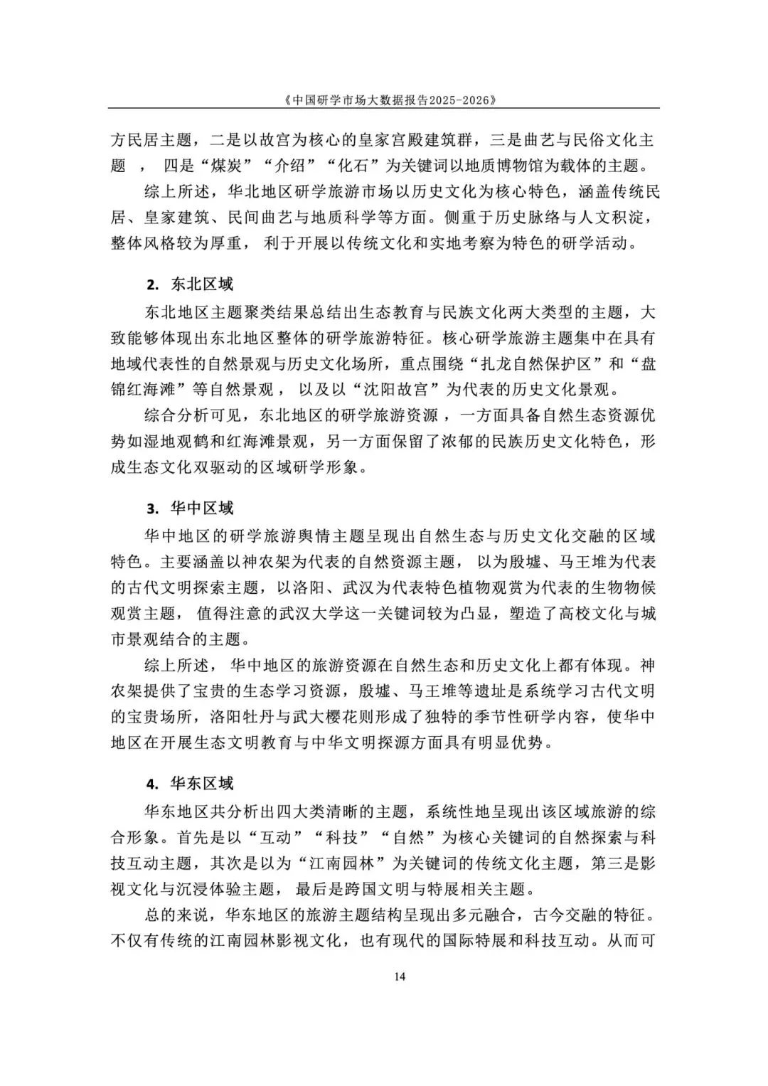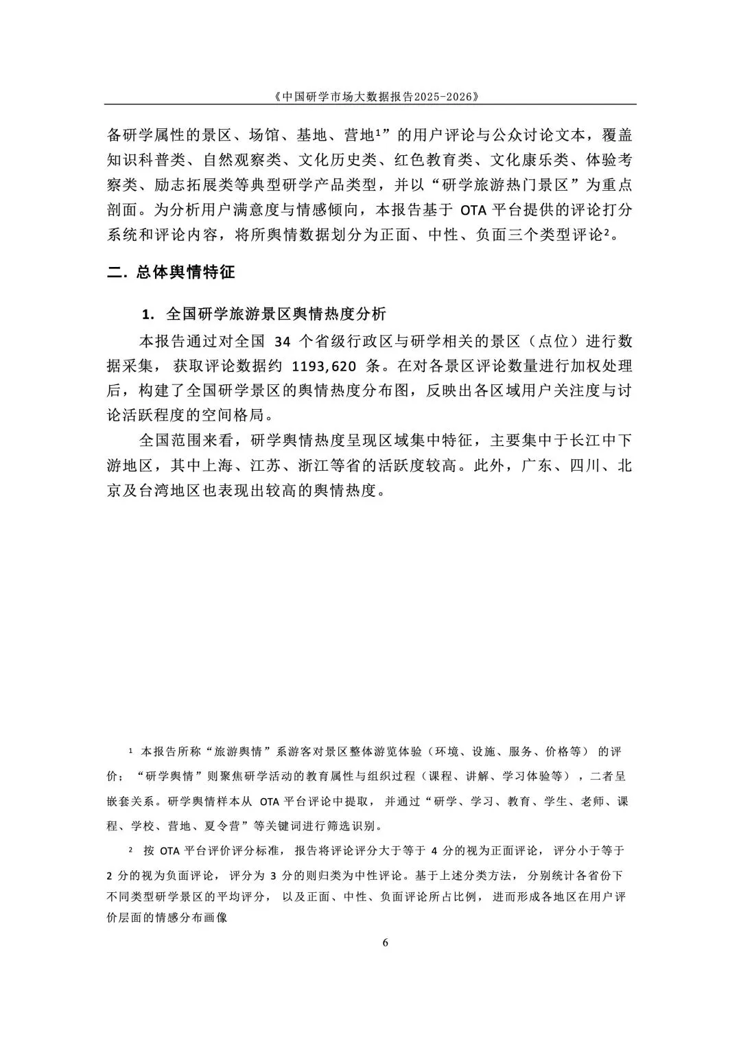 政策与标准双轮驱动,研学纳入正规教育与人才体系。国家将研学实践纳入素质教育,2025 年发布《研学旅游服务要求》行业标准,“研学旅行管理与服务” 纳入高职专业。各地建立安全责任体系与校长负责制,行业从野蛮生长进入标准化、课程化、安全化的高质量发展新阶段,政策长期利好。 市场结构呈梯度分布,学校主导、中小机构为主、区域分化明显。研学消费呈 “低端走量、中端升级、高端定制” 格局,学校组织占主导,专业机构次之。市场主体以旅行社、研学基地为主,中小机构占绝大多数。区域上华东热度最高,华中华北以科普为主,华南体验活跃,西南人文与生态并重,东北以生态研学见长。 用户以中小学家庭为核心,需求从泛体验转向目标化与分层化。核心用户为 K12 学生与家长,学段差异显著:小学重体验、中学重知识与实践。出行以团体大规模与亲子小团并行,团体驱动规模、亲子驱动品质升级。家庭决策更理性,重视教育价值、安全保障、服务质量与性价比,拒绝低质走马观花。 景区研学舆情整体向好,服务与讲解是满意度核心变量。千万评论数据显示,励志拓展、知识科普、自然观赏好评率超 80%。正面集中于风景、知识、互动、体验;负面集中于讲解不专业、行程不合理、门票性价比低、二次消费、服务态度、管理僵化。服务与内容短板成为行业普遍痛点。 行业从规模转向质量,三大趋势重塑竞争格局。一是从资源驱动转向课程 + 服务 + 安全综合能力驱动;二是供给因类施策,自然型补服务、科普型强讲解、文化型提性价比、拓展型优管理;三是区域特色化、品牌化、跨区域联动,文旅深度融合成为提质核心,专业化、数字化、精细化成必由之路。
