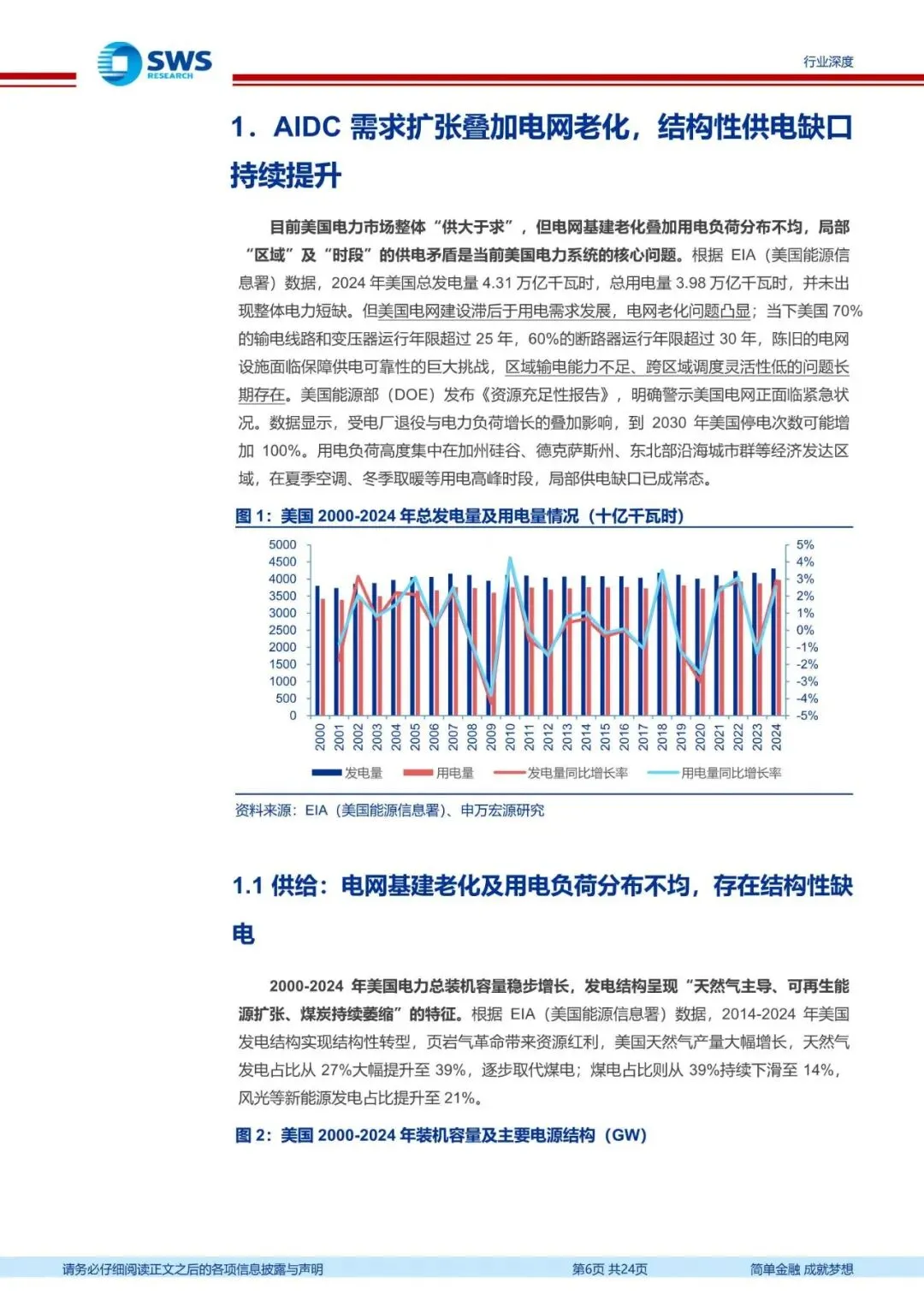 而美国电力市场正面临供给端多重约束,电网基建老化问题突出,70%输电线路和变压器运行年限超 25 年,60%断路器运行超 30 年,区域输电能力不足、跨区域调度灵活性低;且电网供电能力释放滞后于需求增长,算力刚需与供电供给的矛盾持续突出。