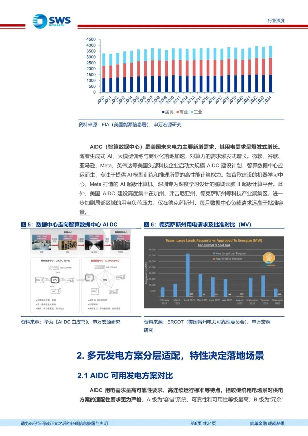 北美 AIDC 结构性电力缺口加剧,高可靠、快响应、可分布式部署的供电方案是破局关键。生成式 AI 大模型训练与商业化落地提速,全球算力需求呈指数级增长,北美头部科技企业开启超大规模 AIDC 建设浪潮,加州、德克萨斯州、弗吉尼亚州等科技产业聚集区用电负荷刚性激增,成为电力需求的核心增量。