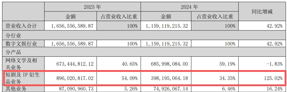 值得关注的是,短剧及IP衍生品收入占比达54.09%,首次超过网络文学业务40.65%的占比,二者合计贡献超九成营收。
