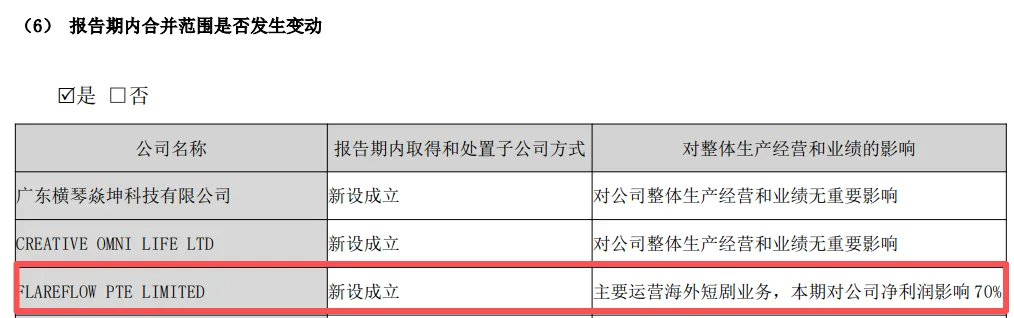 与营收增长形成对比的是,公司2025年出现较大幅度亏损,核心原因与FlareFlow海外短剧业务的前期大额投入直接相关。2025年,FlareFlow实现营业收入3.5亿元,但净亏损超4.7亿元;公司在财报中亦明确提及,FlareFlow本期对公司净利润的影响占比达70%。