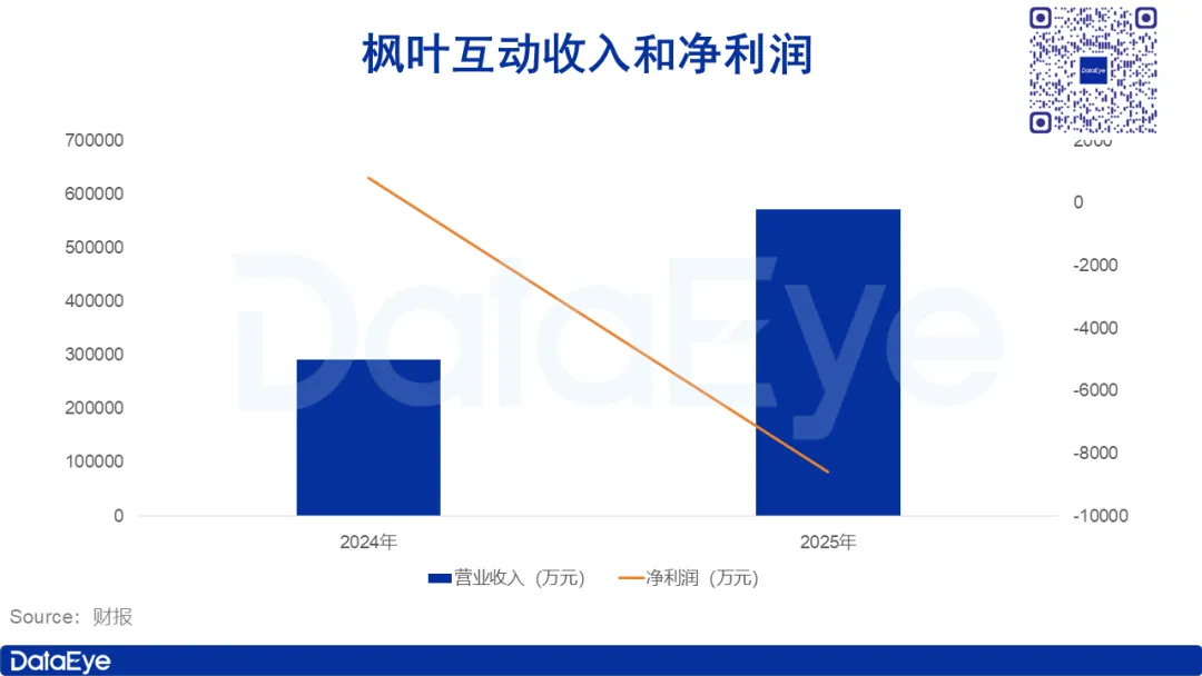 作为Reelshort的母公司,枫叶互动是中文在线出海业务的重要组成部分。2025年,枫叶互动实现收入57.2亿元,同比激增97%,但净亏损超8500万元,由盈利转为亏损。