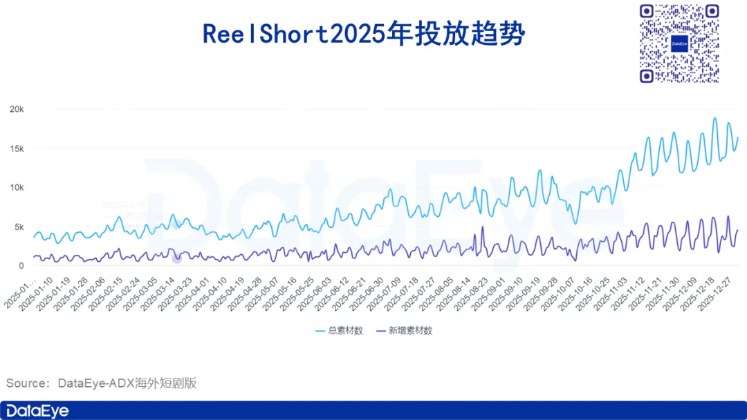 根据DataEye-ADX海外短剧版数据,ReelShort2025年共投放了45万组素材,上半年日均投放素材量超5000组,下半年提升至1.5万组以上,投放力度不断加大。