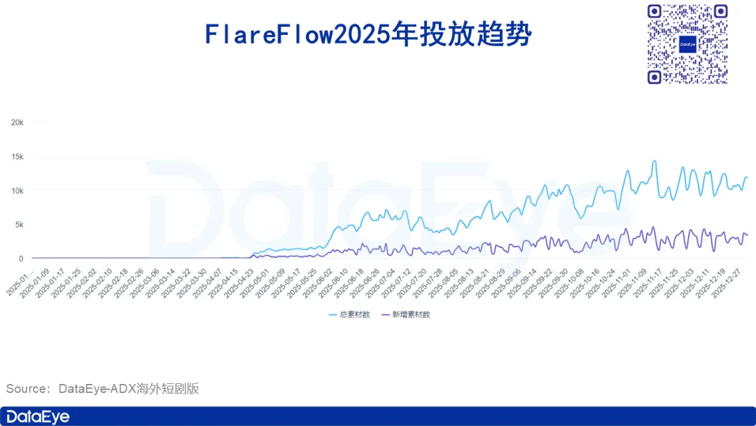 根据DataEye-ADX海外短剧版数据,FlareFlow自2025年4月开始投放,全年共投放了31.7万组素材,第二季度日均投放素材量超5000组,第三季度起提升至1万组以上,投放力度不断加大。