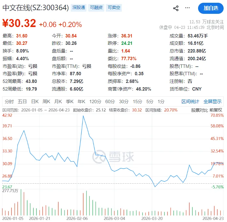 资本市场层面,中文在线当前市值约220.88亿元,今年以来股价累计涨幅超20%,表现相对亮眼。