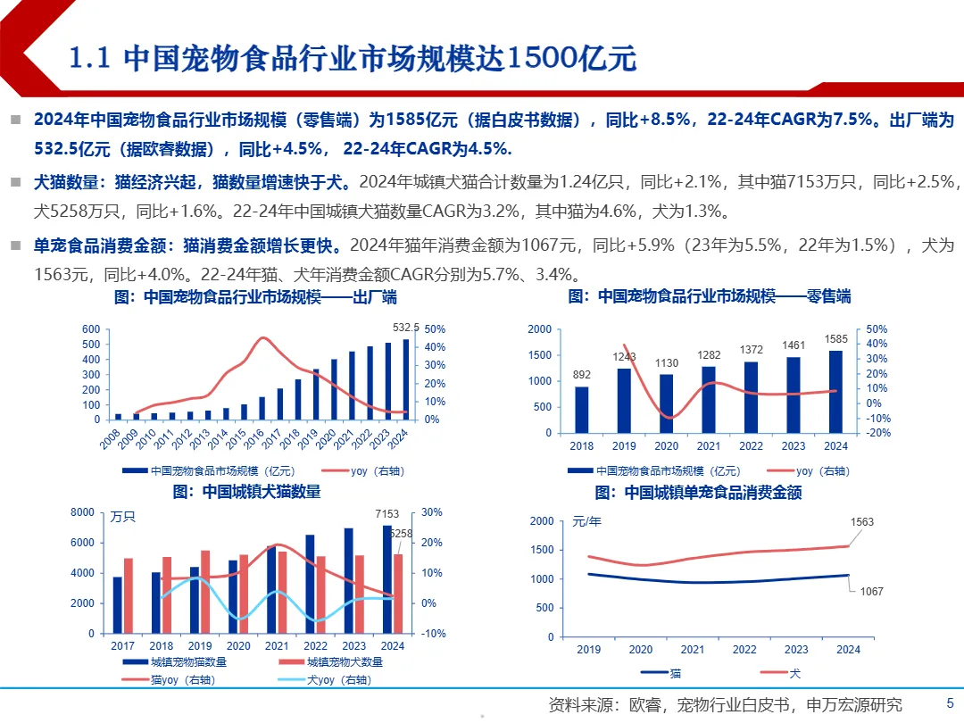 • 市场规模达1585亿元(零售端),年增速8.5%:2024年中国宠物食品零售市场规模达1585亿元,CAGR为7.5%(2022-2024),其中猫经济增速更快,单猫年消费食品金额达1067元,同比增长5.9%,显著高于犬类的4.0%。