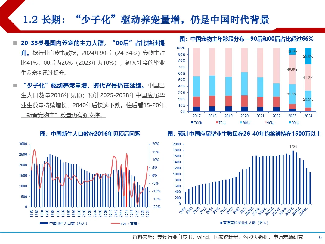• 90后与00后成养宠主力,悦己消费驱动高溢价接受度:90后宠物主占比41%,00后达26%(两年翻倍),82%将宠物视为家人或朋友,92.3%因情感陪伴需求养宠,40.1%的年轻人愿为情绪价值买单,支撑宠物食品高端化逻辑。