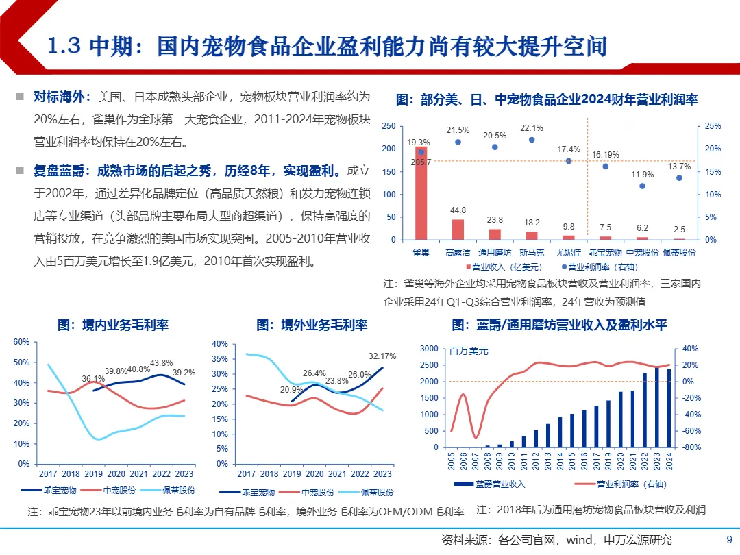 • 乖宝宠物(麦富迪)打造品牌的五大核心能力:① 战略聚焦(从多品牌转向打造单一强势品牌);② 抢占电商红利(2013年入驻天猫,线上市占率从4.9%升至8.1%);③ 长期主义营销(冠名综艺、IP联名、达人矩阵投放,抖音商品卡销售占比超90%);④ 强研发支撑(2%研发费率,拥有“气爆营养释放”“超微乳化”等专利技术);⑤ 产品持续迭代上探价格带(barf系列、弗列加特等推动客单价三年增长近40%)。