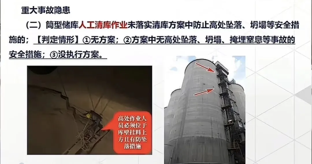第二个事故类型就是坍塌了。好多兄弟就没有想到这方面吧?坍塌事故主要集中在料仓、筒库等设备的物料清堵、设备内部检修、临时应急处置等这些关键的作业环节。但是这块需要注意,坍塌不是指整个料仓整个建筑结构都坍塌了,而是指向水泥库在清理挂壁物料的时候物料坍塌导致的作业人员的掩埋。这块是要敲重点的!水泥成品桶型库的清库作业是存在重大事故隐患的重中之重,这活看着就很危险。