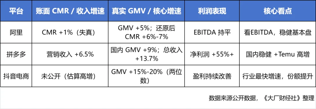 更关键的是,把阿里、抖音、拼多多放在一起看,三大平台真实增速格局清晰可见——不是阿里不行,而是行业进入“稳健分化期”,每家规模、增速、逻辑完全不同。