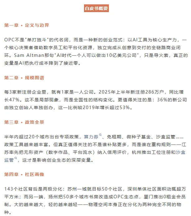 2026年的春天,这个问题有了肯定的答案。从苏州到深圳,从成都到上海,一种名为OPC(One Person Company,一人公司)的创业范式正以前所未有的速度席卷全国。它不再仅仅是法律意义上的单一股东公司,更是被赋予了全新的时代内涵:个人借助AI工具,独立完成产品设计、研发、营销、服务等全链条业务,实现“单人成军”的新型创业模式。