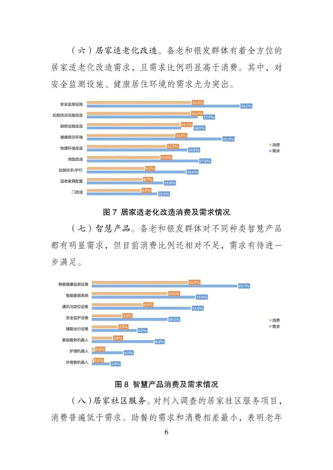 居家适老化改造需求全面高于消费,安全与健康导向突出。安全监测设施需求 24.1%、消费 16.4%,健康居住环境需求 21.3%,是最受关注的两项。如厕洗浴设施改造、厨房设施改造、地面改造、加装扶手护栏、适老家具配置、门改造等项目,均呈现需求高、消费低的格局。居家养老仍是绝大多数银发群体的首选,家庭场景的安全、便利、舒适成为核心诉求,适老化改造从可选配置变成刚性需求,市场供给分散、标准不统一、服务不便捷,制约消费释放。