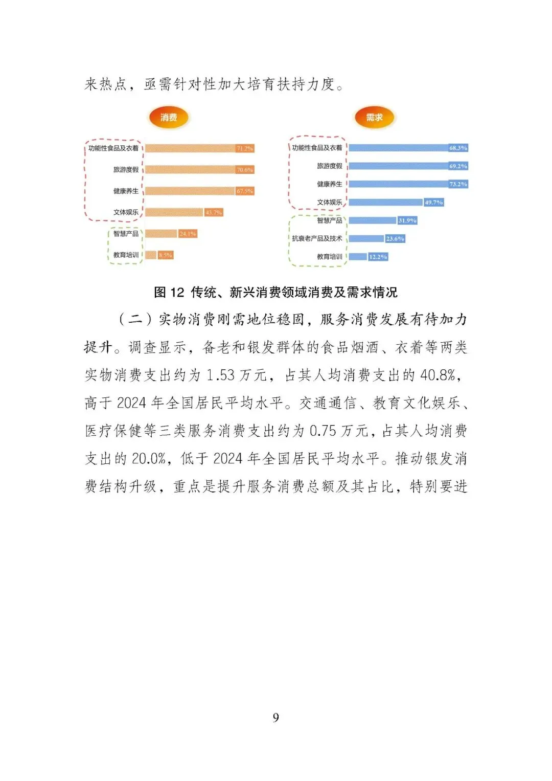 实物消费依然是银发支出的大头。调查显示,食品烟酒与衣着两项实物消费年支出约 1.53 万元,占人均消费支出的 40.8%,高于 2024 年全国居民平均水平。交通通信、教育文化娱乐、医疗保健三类服务消费年支出约 0.75 万元,占比仅 20.0%,低于全国平均水平。银发消费结构升级的关键,在于提升服务消费规模与占比,推动从吃饱穿暖的基础满足,向健康、娱乐、社交、自我实现的高品质服务消费延伸。