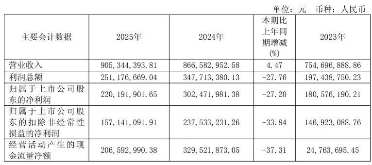 4月19日,杭州奥泰生物技术股份有限公司发布2025年年报,报告期内,公司实现营收9.05亿,较去年同期增加4.47%,归属于上市公司股东的净利润2.20亿,较去年同期减少27.20%,经营活动产生的现金流量净额为2.07亿,较去年同期减少37.31%。