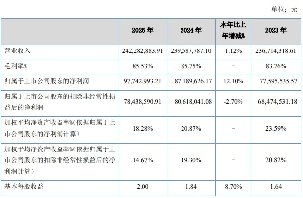 4月7日,丹娜(天津)生物科技股份有限公司发布2025年年报,报告期内,公司实现营收2.42亿,较去年同期增加1.12%,归属于上市公司股东的净利润0.98亿,较去年同期增加12.10%,经营活动产生的现金流量净额为0.46亿,较去年同期减少24.06%。