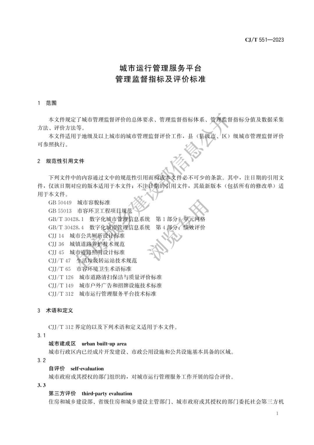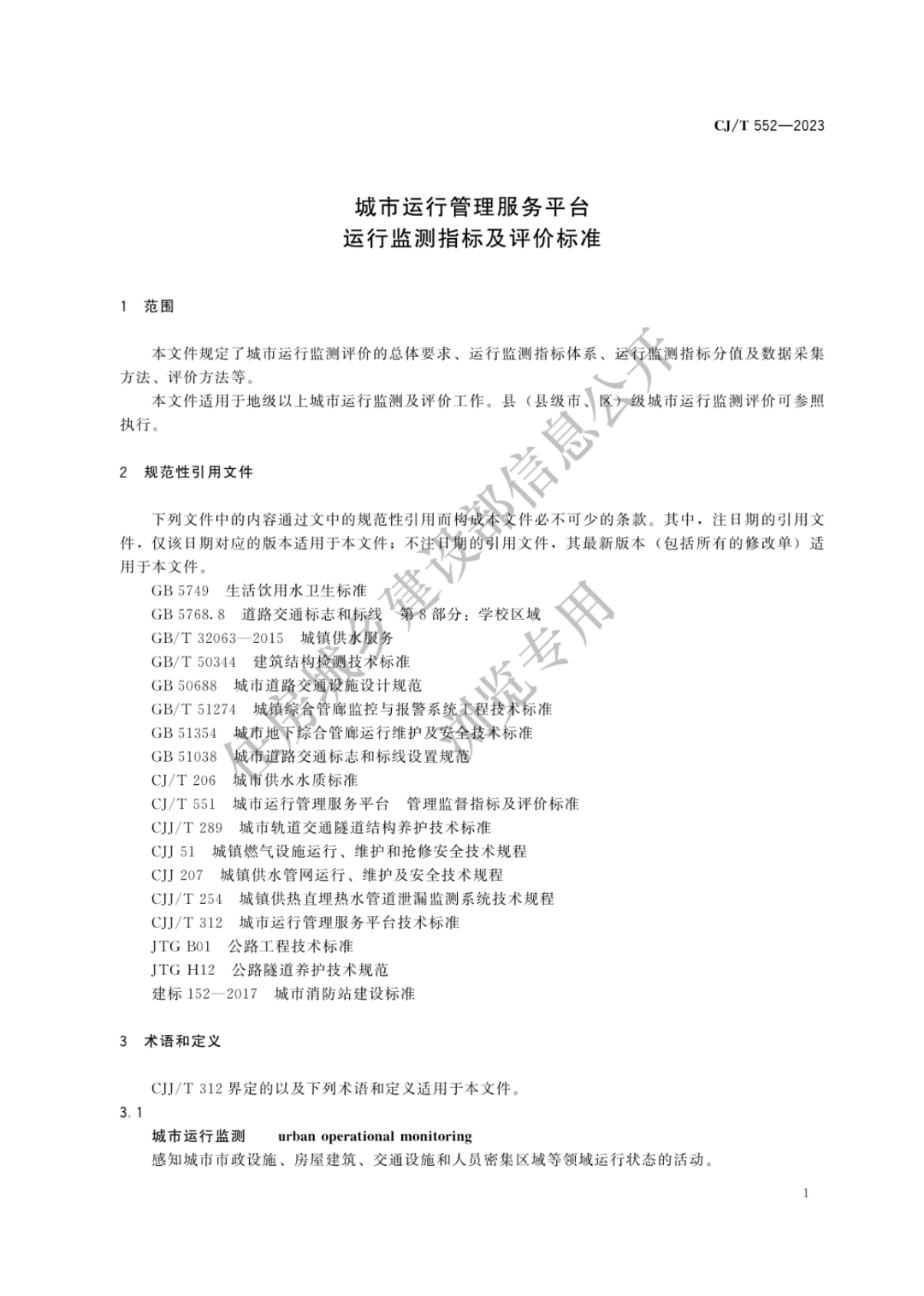 《城市运行管理服务平台 管理监督指标及评价标准》、《城市运行管理服务平台 运行监测指标及评价标准》为城乡建设行业产品标准,编号分别为CJ/T551-2023、CJ/T552-2023,均自2023年11月1日起实施。