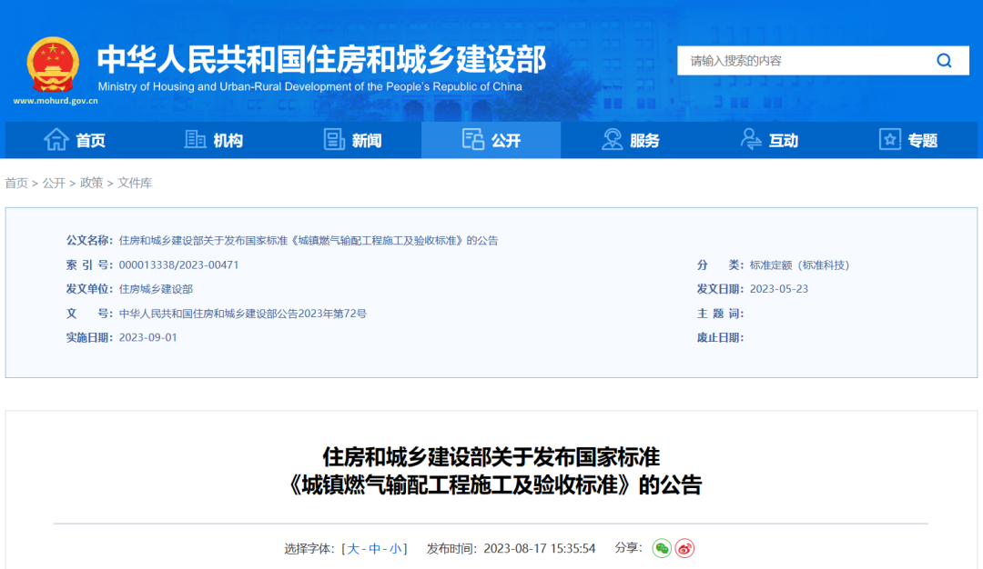 现批准《城镇燃气输配工程施工及验收标准》为国家标准,编号为GB/T51455-2023,自2023年9月1日起实施。原行业标准《城镇燃气输配工程施工及验收规范》(CJJ33-2005)同时废止。