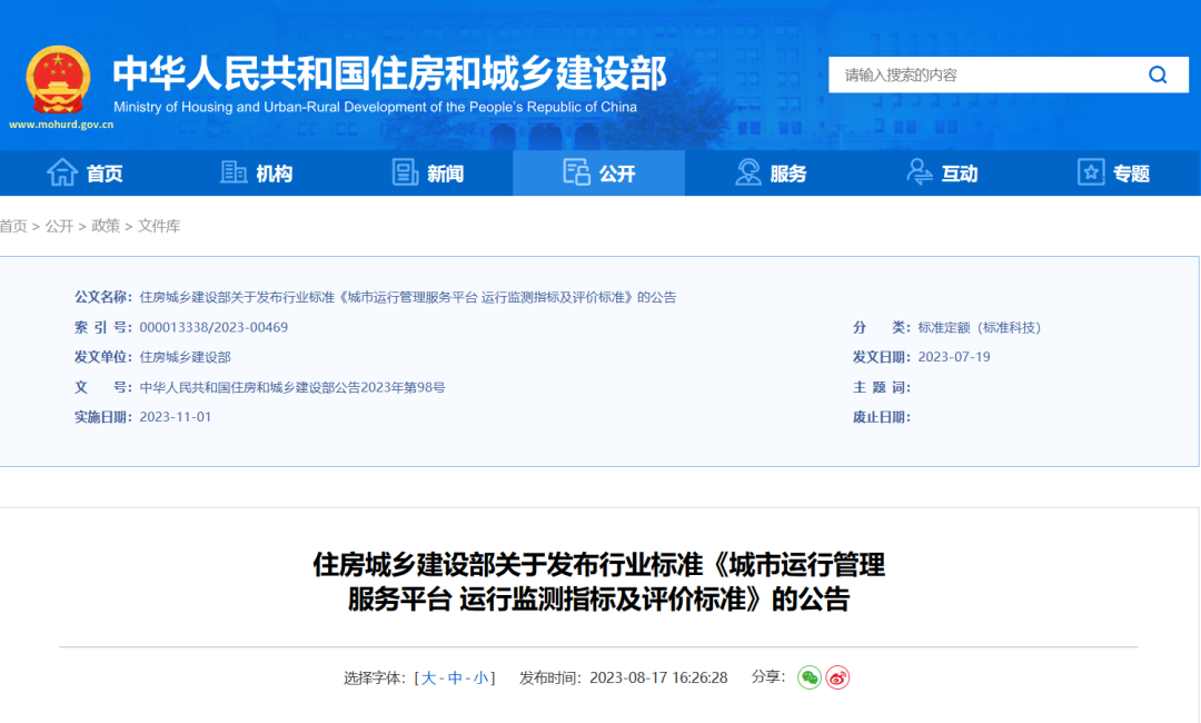 现批准《城市运行管理服务平台 管理监督指标及评价标准》为城乡建设行业产品标准,编号为CJ/T551-2023,自2023年11月1日起实施。