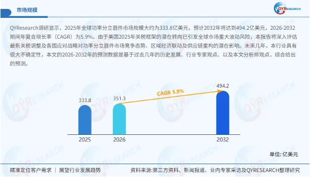 在 AI 算力、新能源汽车与光伏储能的三重驱动下,分立功率器件正迎来量价齐升的黄金周期。最新行业数据显示,2025 年全球分立功率器件市场规模已达333.8 亿美元,预计 2032 年将突破494.2 亿美元,年复合增长率5.9%。作为电力电子系统的 “心脏”,这场围绕市场占有率、技术壁垒与供应链主导权的全球竞争,正进入白热化阶段。